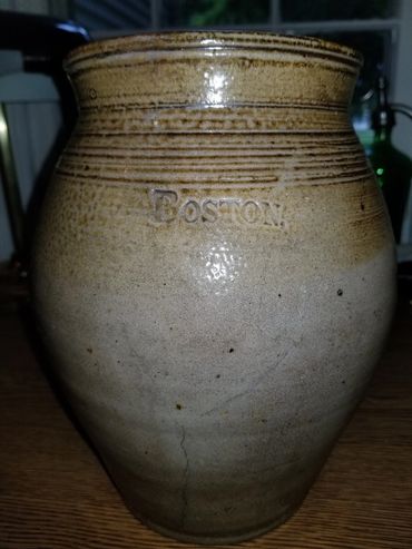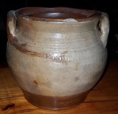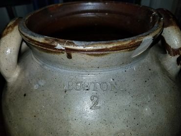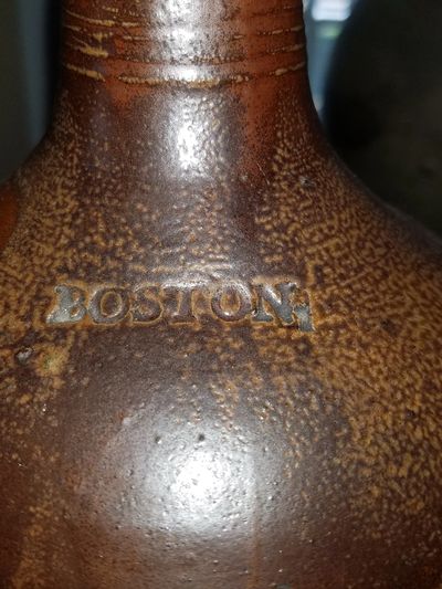 IT SHOULD BE NOTED THAT THESE TWO MEN, IN THIS VERY SHORT TIME PERIOD, COULD HAVE BEEN AT LYNN ST. WORKING TOGETHER, OR POSSIBLY AT DIFFERENT TIMES. BOTH POTTERS MARKED THE STONEWARE WITH IDENTIFIABLE STAMPS WHICH READ "BOSTON", ALL CAPITAL LETTERS. THE LETTERS APPEAR TO BE TYPEFACE WHICH WERE USED, WORN LETTERS, NO LONGER USEFUL FOR PRINTING ON PAPER, BUT WELL SERVED FOR THIS APPLICATION. THEY WERE ACQUIRED MOST LIKELY FROM A LOCAL NEWSPAPER AND LOOK TO HAVE BEEN MOUNTED IN SOME MANNER TO MAKE A STAMP OF SORTS. THE MAKER STAMP HAD SOME EXCEPTIONS WITH FENTON USING A FISH, A CARTOUCHE OF HIS INTIALS AND OTHER RARE EXCEPTIONS. CARPENTER EXAMPLES HAVE BEEN FOUND WITH A QUATREFOIL, HEARTS AND ALSO OTHER RARE EXCEPTIONS.