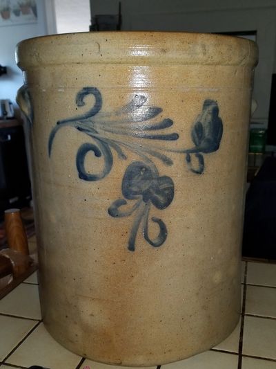 We found this crock outside of Philadelphia in the cellar of a collectors home. The owner told us that it had been in his cellar since before he could remember. He was in his late 80's and the home belonged to his family since 1871. It was the first …..and only....Wingender crock we have ever seen of this size. The crock measured out at 19" tall and weighed 26 pounds! Crocks like this were used mostly for fermentation.