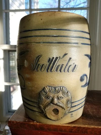 Water coolers were used in daily life to keep a supply of cool fresh water on hand. This one once had a tap which fit into the NORTHWIND FACE there at the base on the front. It also came with a nicely styled lid which was dome shaped and matched the cooler's design.