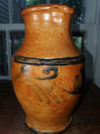 This small pint size pitcher was in a box lot at a country auction. We saw it and thought at first it was nothing special because the coloration threw us off. In this case, the usual grey toned stoneware and the rich blue cobalt glaze we usually see on Windgender stoneware, was replaced by this golden toned exterior and almost black cobalt design work.