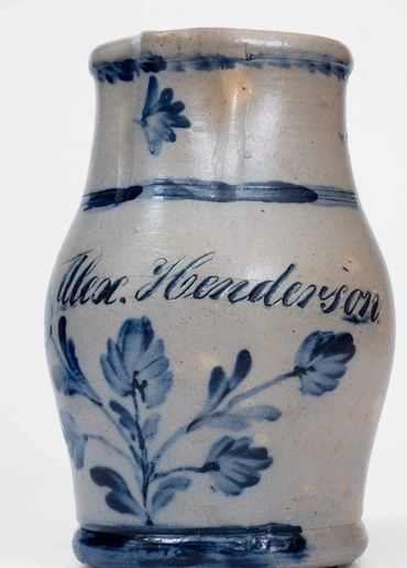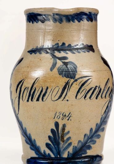 Wingender stoneware examples are not marked with the names of the brothers, however, the stoneware made by them is quite identifiable. The Wingender's used symbolistic Germanic blue cobalt design on most of their stoneware. These designs are quite traceable back to European designs used in Germany for many years. The designs usually depict fruit or clouds an other natural features adapted by German artisans.